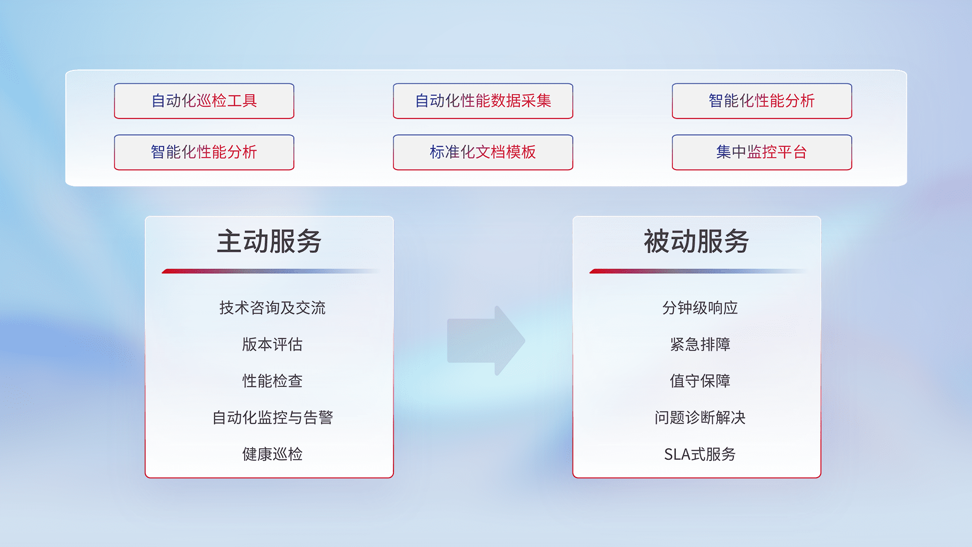 智能化工具和标准化文档,,保障服务质量,,,提供主动服务(包含技术咨询、、版本评估、、性能检查、、、自动化监控与告警、、、、健康巡检)和被动服务包含(分钟级响应、、、、紧急排障、、、、值守保障、、、、问题诊断解决、、SLA服务)。。